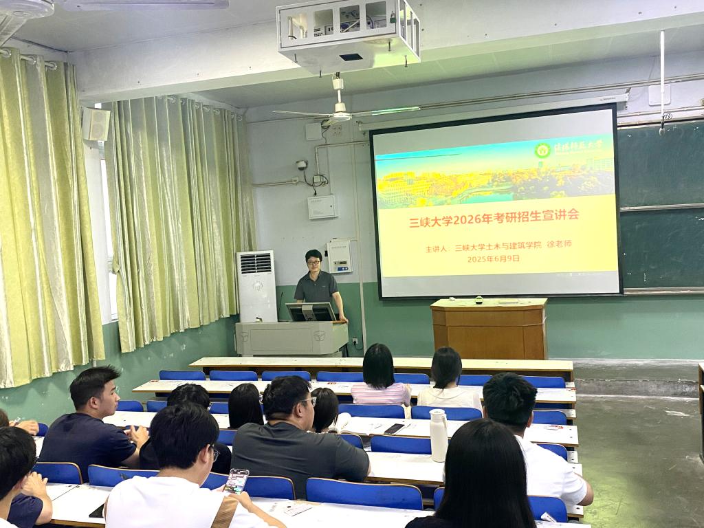 2025年6月9日,三峡大学土木与建筑学院研究生办公室主任徐潇宇来我院开展研究生招生宣讲活动。本次宣讲会在教2梯5教室举行,重点面向我院2022级本科生,学院副院长袁晓辉主持活动。