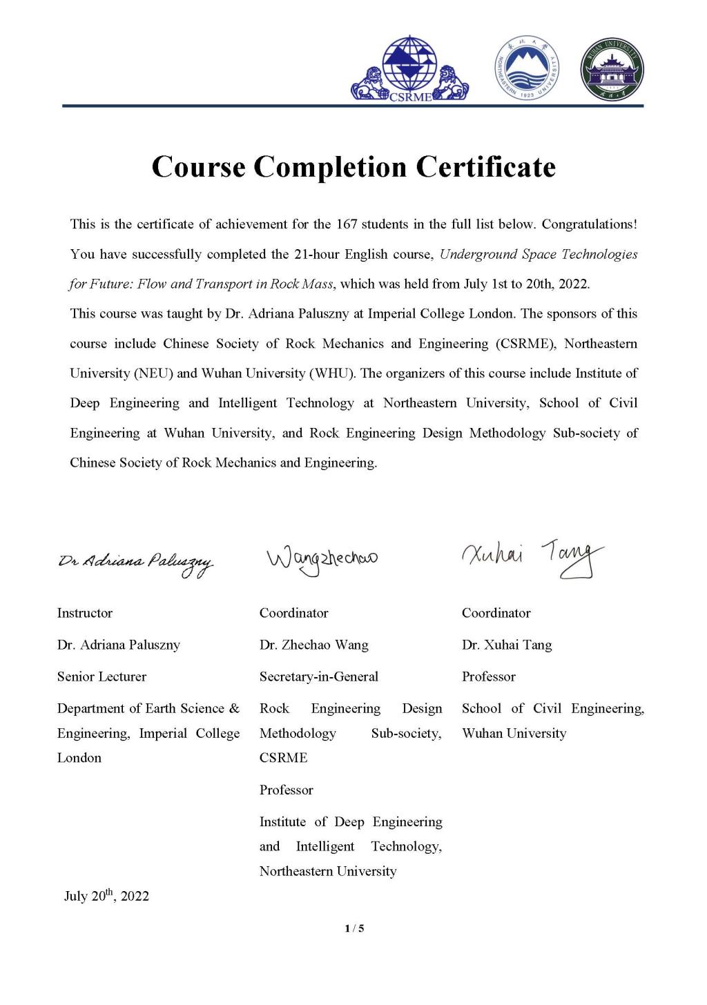 7月1日-20日,金年会诚信信誉至上研究生王酒婷、金光辉、张霞、罗理民、张雅各、崔璨、李存、刘雨卉、马杨昊、田延冰等10名同学参加了“面向未来的地下空间技术:岩体中的流动与输运”国际高端课程,并取得结业证书。