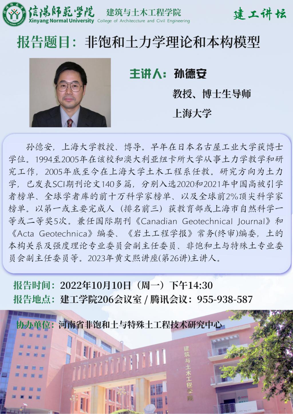 报告人简介:孙德安,上海大学教授、博导。早年在日本名古屋工业大学获博士学位。1994至2005年在该校和澳大利亚纽卡所大学从事土力学教学和研究工作,2005年底至今在上海大学土木工程系任教。研究方向为土力学,已发表SCI期刊论文140多篇,分别入选2020和2021年中国高被引学者榜单、全球学者库的前十万科学家榜单、以及全球前2%顶尖科学家榜单。以第一或主要完成人(排名前三)获教育部或上海市自然科学一等或二等奖5次。兼任国际期刊《Canadian Geotechnical Journal》和《Acta Geotechnica》编委、《岩土工程学报》常务(终审)编委,土的本构关系及强度理论专业委员会副主任委员、非饱和土与特殊土专业委员会副主任委员等。2023年黄文熙讲座(第26讲)主讲人。