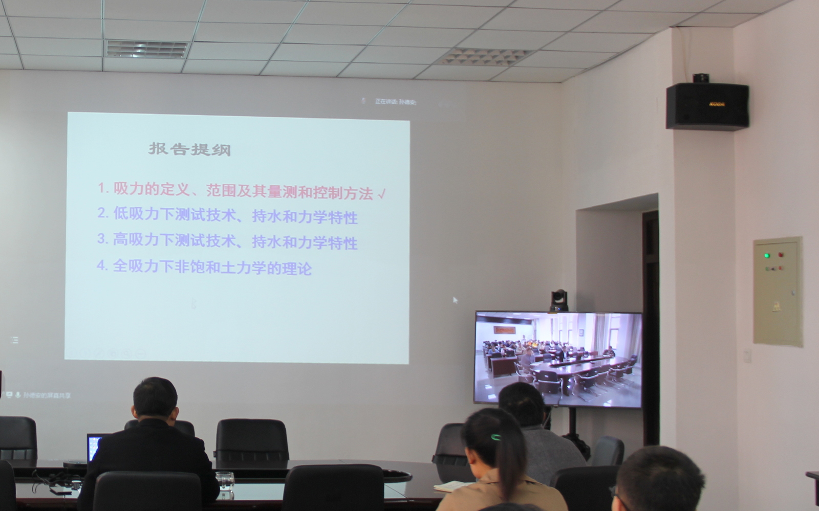 报告会上,孙德安教授首先介绍了非饱和土力学的基础理论,包括吸力定义、范围及其量测和控制方法,重点讨论了非饱和土的应力选择。然后,通过对比饱和土与非饱和土力学性质的异同,介绍了非饱和土的弹性模型、弹塑性本构模型、持水和力学特性耦合的弹塑性本构模型。最后,详细分析了水-力耦合模型的构建思路,介绍了耦合模型在预测非饱和土的应力应变关系和强度时同时考虑吸力和饱和度的影响,同时在预测持水特性时,不仅考虑吸力,而且还考虑土体变形对非饱和土含水率的影响。
