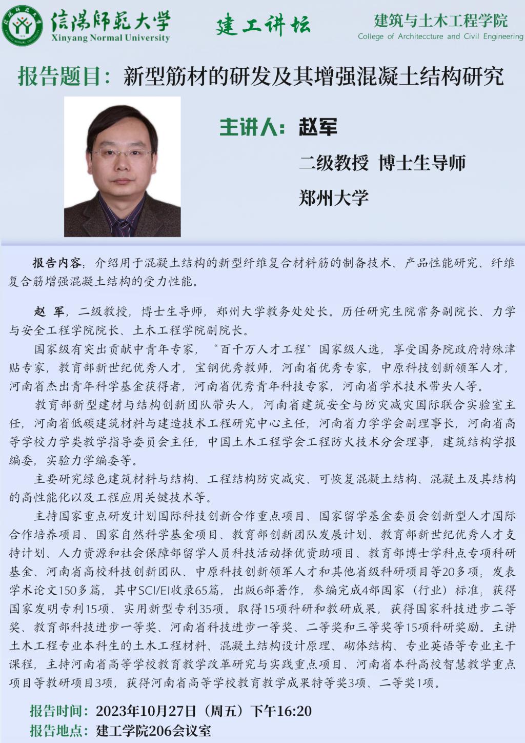 报告人简介:赵 军,二级教授,博士生导师,郑州大学教务处处长。历任研究生院常务副院长、力学与安全工程学院院长、土木工程学院副院长。国家级有突出贡献中青年专家,“百千万人才工程”国家级人选,享受国务院政府特殊津贴专家,教育部新世纪优秀人才,宝钢优秀教师,河南省优秀专家,中原科技创新领军人才,河南省杰出青年科学基金获得者,河南省优秀青年科技专家,河南省学术技术带头人等。教育部新型建材与结构创新团队带头人,河南省建筑安全与防灾减灾国际联合实验室主任,河南省低碳建筑材料与建造技术工程研究中心主任,河南省力学学会副理事长,河南省高等学校力学类教学指导委员会主任,中国土木工程学会工程防火技术分会理事,建筑结构学报编委,实验力学编委等。主要研究绿色建筑材料与结构、工程结构防灾减灾、可恢复混凝土结构、混凝土及其结构的高性能化以及工程应用关键技术等。主持国家重点研发计划国际科技创新合作重点项目、国家留学基金委员会创新型人才国际合作培养项目、国家自然科学基金项目、教育部创新团队发展计划、教育部新世纪优秀人才支持计划、人力资源和社会保障部留学人员科技活动择优资助项目、教育部博士学科点专项科研基金、河南省高校科技创新团队、中原科技创新领军人才和其他省级科研项目等20多项;发表学术论文150多篇,其中SCI/EI收录65篇,出版6部著作,参编完成4部国家(行业)标准;获得国家发明专利15项、实用新型专利35项。取得15项科研和教研成果,获得国家科技进步二等奖、教育部科技进步一等奖、河南省科技进步一等奖、二等奖和三等奖等15项科研奖励。主讲土木工程专业本科生的土木工程材料、混凝土结构设计原理、砌体结构、专业英语等专业主干课程,主持河南省高等学校教育教学改革研究与实践重点项目、河南省本科高校智慧教学重点项目等教研项目3项,获得河南省高等学校教育教学成果特等奖3项、二等奖1项。