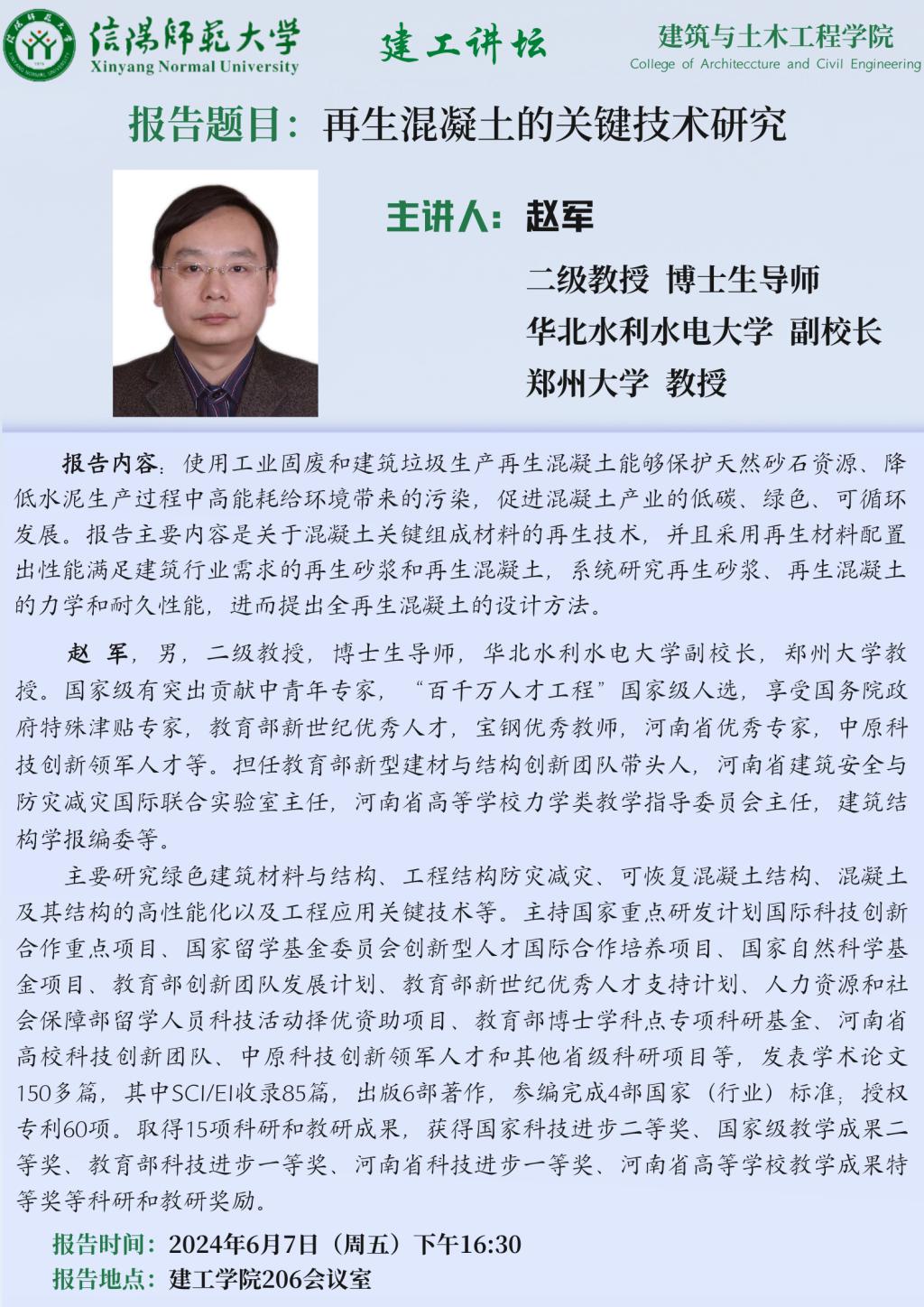 报告人简介:赵 军,男,二级教授,博士生导师,华北水利水电大学副校长,郑州大学教授。国家级有突出贡献中青年专家,“百千万人才工程”国家级人选,享受国务院政府特殊津贴专家,教育部新世纪优秀人才,宝钢优秀教师,河南省优秀专家,中原科技创新领军人才等。担任教育部新型建材与结构创新团队带头人,河南省建筑安全与防灾减灾国际联合实验室主任,河南省高等学校力学类教学指导委员会主任,建筑结构学报编委等。
