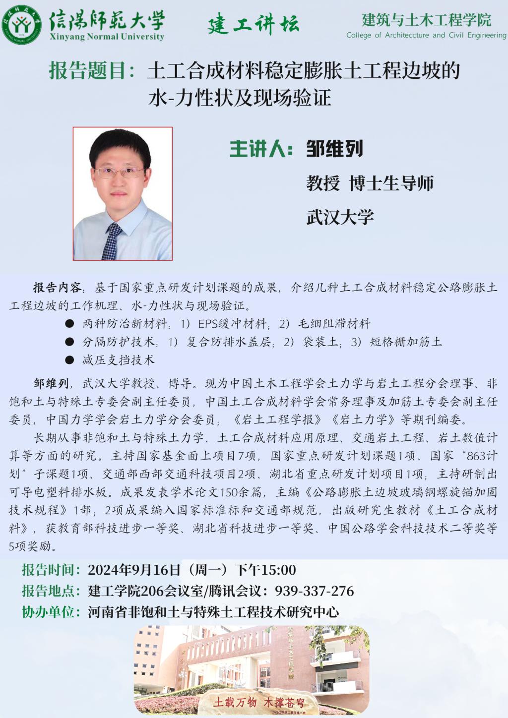 报告人简介:邹维列,武汉大学教授、博导。现为中国土木工程学会土力学与岩土工程分会理事、非饱和土与特殊土专委会副主任委员,中国土工合成材料学会常务理事及加筋土专委会副主任委员,中国力学学会岩土力学分会委员;《岩土工程学报》《岩土力学》等期刊编委。长期从事非饱和土与特殊土力学、土工合成材料应用原理、交通岩土工程、岩土数值计算等方面的研究。主持国家基金面上项目7项,国家重点研发计划课题1项、国家“863计划”子课题1项、交通部西部交通科技项目2项、湖北省重点研发计划项目1项;主持研制出可导电塑料排水板。成果发表学术论文150余篇,主编《公路膨胀土边坡玻璃钢螺旋锚加固技术规程》1部;2项成果编入国家标准标和交通部规范,出版研究生教材《土工合成材料》,获教育部科技进步一等奖、湖北省科技进步一等奖、中国公路学会科技技术二等奖等5项奖励。