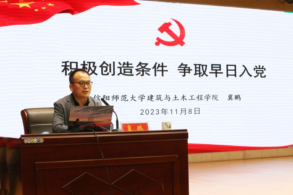 11月8日晚,金年会jinnianhuicom党委副书记冀鹏应邀在理科楼报告厅为信阳师范大学第40期党员发展对象培训班作《积极创造条件 争取早日入党》专题报告,共有649名党校学员通过线上+线下形式聆听报告。