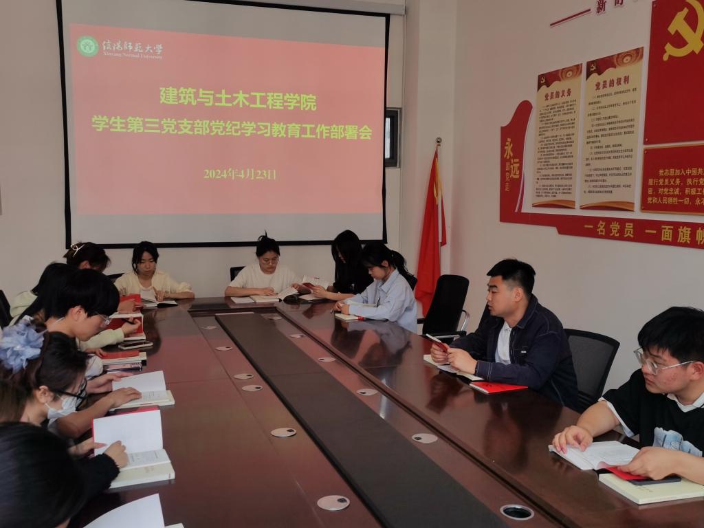 根据建筑与土木学院党委工作安排部署,4月23日上午,金年会jinnianhuicom学生第三党支部在学院楼402召开党纪学习教育工作部署会,支部全体党员参加会议。