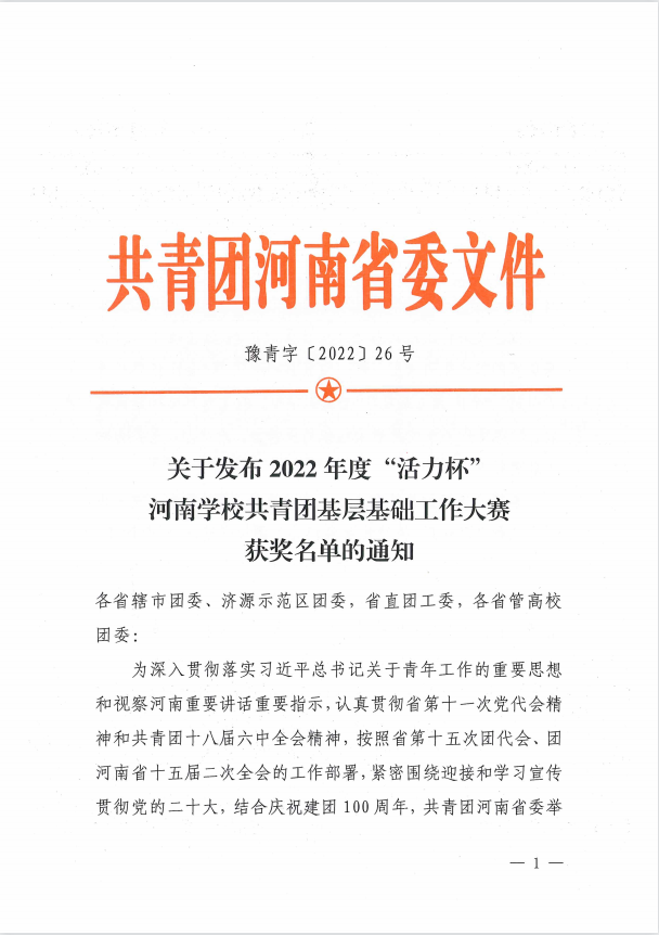 我院在2022年度“活力杯”河南学校共青团基层基础工作大赛中获奖