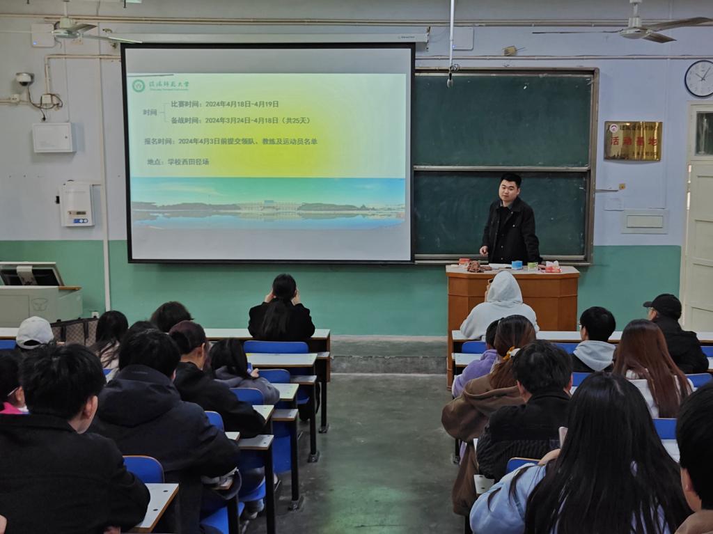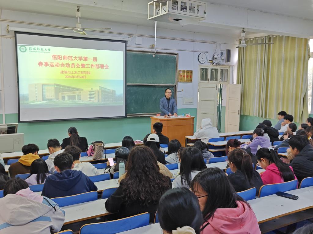 为认真做好春季运动会准备工作,充分调动学生的参赛热情,3月24日,金年会jinnianhuicom在教2T5召开信阳师范大学第一届春季运动会动员会,学院党委副书记冀鹏,团委老师冯舒心,学院各班级学生代表参加会议。