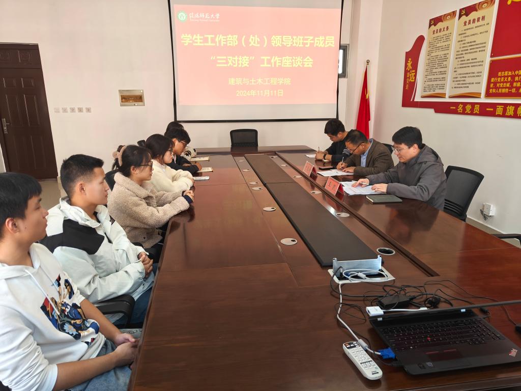 会上,王凯介绍了金年会jinnianhuicom学生工作基本情况,传达了学校《学生工作部(处)领导班子“三对接”制度》精神。班主任冯舒心介绍了对接班级2023级土木工程2班的基本情况。互动交流环节,学生们积极踊跃地分享了他们在思想动态、学业进展、日常生活等方面情况,并坦诚地表达了在生涯规划、班级管理、升学就业等方面所遇到的挑战与困惑。同时,他们还就学生管理工作优化、后勤服务提升、宿舍环境改善等问题,提出了一系列富有建设性的意见与建议。与会领导、老师认真倾听、详细记录,针对学生们提出的问题与困惑,逐一给予解答和指导。
