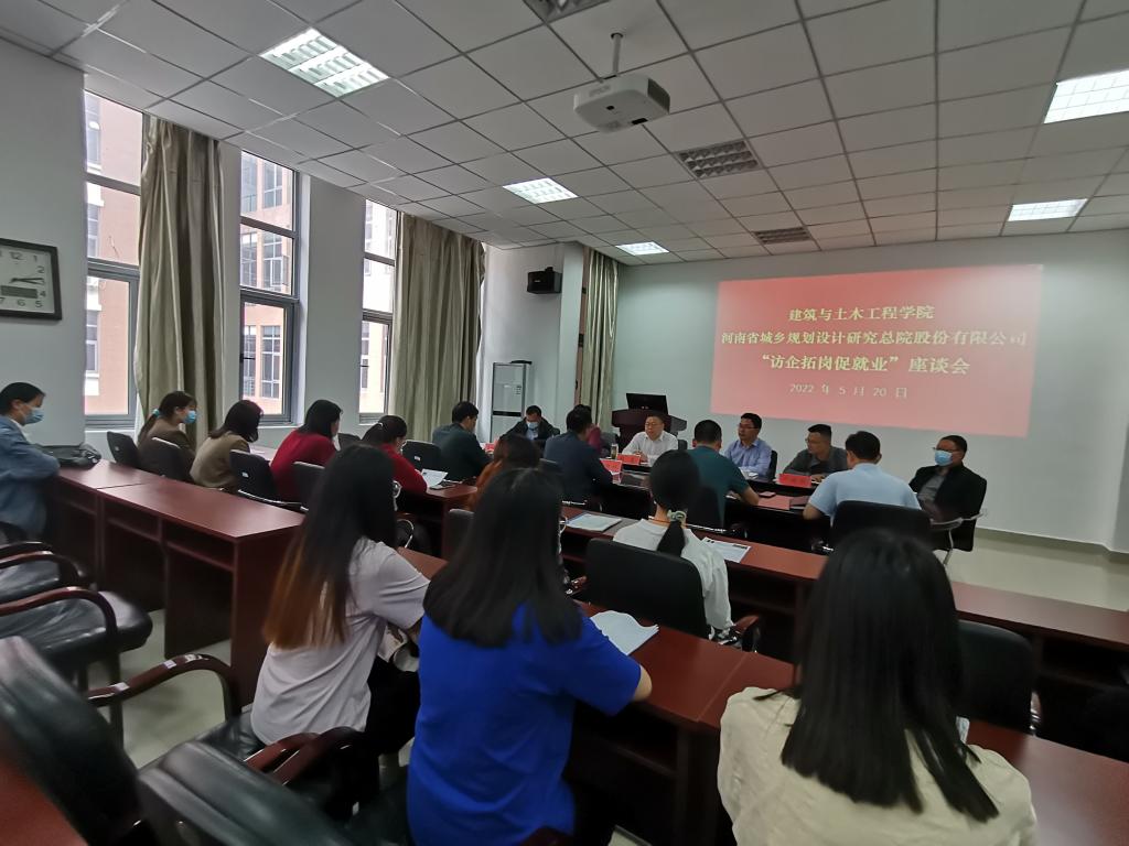 5月20日下午,金年会jinnianhuicom与河南省城乡规划设计研究总院股份有限公司在土木楼206会议室召开“访企拓岗促就业”座谈会。河南省城乡规划设计研究总院股份有限公司信阳院院长张军、建筑所所长梁旺、金年会jinnianhuicom党委书记方明科、党委副书记冀鹏、副院长肖琪聃、袁晓辉和毕业生代表等共30余人参加座谈会。