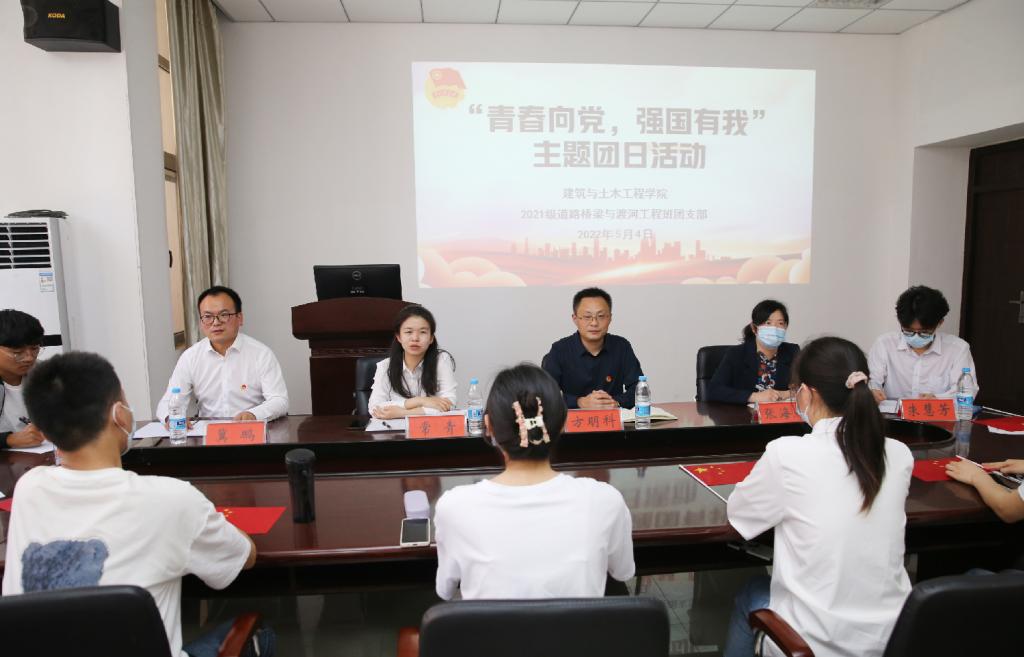 5月4日下午,金年会jinnianhuicom2021级道路桥梁与渡河工程班团支部“青春向党 强国有我”主题团日活动在综合实验楼206会议室举行。校团委副书记常青、金年会jinnianhuicom党委书记方明科、党委副书记冀鹏和共青团员代表共40余人参加活动。活动由班级团支书赵琦琦主持。